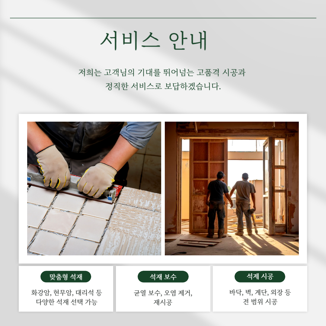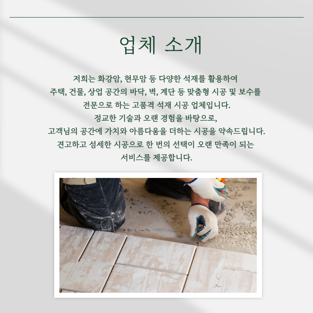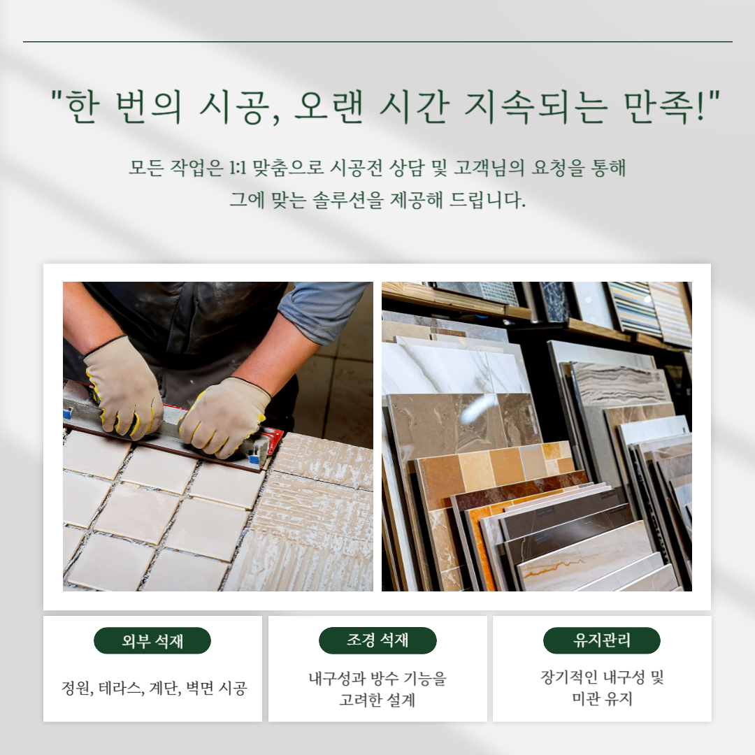 고급스럽고 내구성 높은 석재 시공, 전문가의 손길로 완성됩니다.